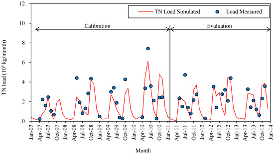 Simulated and measured monthly total nitrogen (TN) load at the outlet.