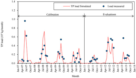 Considering the availability of water quality monitoring data and the goal of this study, total nitrogen (TN) and total phosphorus (TP) were selected as appropriate water quality indicators for calibration and evaluation. All nutrient data were obtained from Honggebo pumping station at the outlet of the Hetao catchment. The comparisons between the simulated and measured results for the monthly TN and TP loads are shown in Figure 3 and Figure 4, respectively; as noted earlier, data are only available for May to October 2007–2013. The NSE values for monthly total nitrogen and phosphorus are 0.63 and 0.64, respectively, for the calibration period from 2007 to 2010; and 0.48 and 0.42, respectively, for the evaluation period from 2011 to 2013. The bias is also very low (|PBIAS| < 10%) for TN; the bias of TP is much higher (|PBIAS| < 37%) (Table 2). These modeling results are considered acceptable even though some individual observations may show considerable differences [41].