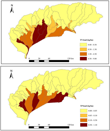 Agricultural activities such as tillage, fertilization, and irrigation scheduling have significant effects on the generation of ANSP pollution. Figure 5 is a diagram of spatial distributions of source areas of the TN and TP loads for Scenario 1. It clearly indicates that the cropped area is the main contributor of TN and TP loads in this watershed. Each subbasin has a different value which depends on the dominant crops. Traditional agricultural practices such as flood irrigation through irrigation canals and drainage channels across the Hetao irrigation district aggravate the nutrient losses. Although farmers now till fertilizer into the top 10–15 cm of soil to reduce nutrients losses based on past experiments and experience, excess fertilization is a common condition in this area, which leads to serious nutrient losses.