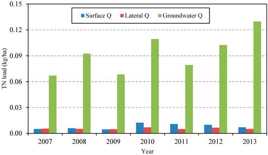 Nitrate anion exclusion is a contributor to nitrogen leaching in the study area. This is because the solubility of NO3− is over 1 kg·L−1 and it is repelled by the soil’s negative charge. Irrigation water interception removes a significant amount of nitrate from the soil. As the data presented in Figure 3 indicates, TN has similar temporal characteristics to those exhibited by the stream flow in the region, with two peaks caused by irrigation schemes and the subsequent percolation focused on the two irrigation periods. Figure 6 compares the nitrate loads in the surface runoff, lateral saturated flow and groundwater discharge; the groundwater contributes about 82% of the total load.