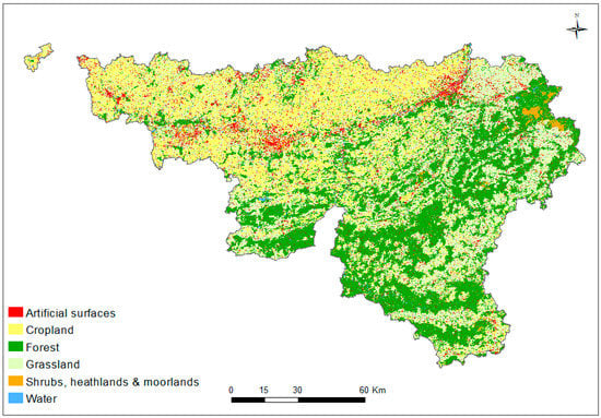 Population density in Wallonia is 202 inhabitants per square kilometer and, with hardly less than 1% of the territory beneficiating of a natural reserve status, all landscapes are mostly managed or perturbed by human activities. Main LULC are agriculture land (52%) comprising grassland (30%) and cropland (22%); forests (30%) split into needle-leaved (13%), broad-leaved (16%) and mixed forests (1%); and artificial surfaces (10%) (see LULC dataset, Section 2.4 and Figure 2). Cropland cover is mostly located in the North of the region and at a low elevation while forests (especially needle-leaved forests) are located in the South at a higher elevation. In the studied sub-catchments (see delineation method below), the most represented LULC classes are forests, grassland and cropland (see boxplot in Supplementary Materials Figure S1).
