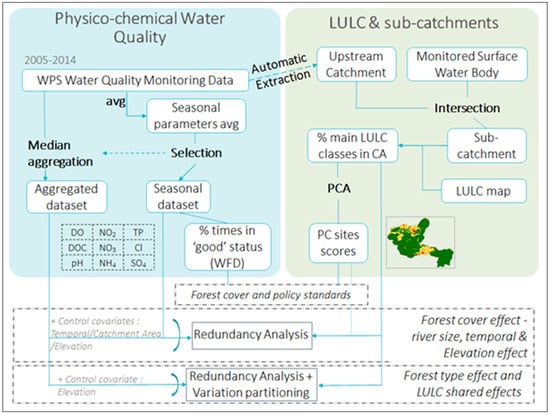 The overall methodology is illustrated in Figure 3 and described below. The first section describes the physico-chemical water quality dataset processing. Secondly, the delineation of sub-catchments and LULC characterization are explained. Finally, the methodology to assess the link between forest cover and water quality is presented. In this last part, we detail the following analyses: the link between forest cover and WFD standards, the quantification of the forest cover effects on water quality and spatio-temporal aspects, and, finally, the partitioning of the LULC effect on water quality between forest types and LULC and their shared effects while controlling for ecological gradient.