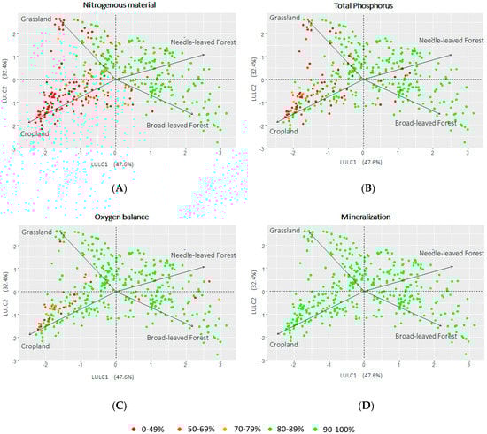 Biplot representing the monitoring stations from a PCA on the main land cover classes in studied sub-catchments. Colors represent the percentage of time the station was classified in “good status” according to current Water Framework Directive standards regarding: (A) the “nitrogeneous material” group (i.e., nitrates, nitrites and ammonium); (B) total phosphorus; (C) the “oxygen balance” group (i.e., dissolved oxygen and dissolved organic carbon) and (D) the “mineralization” group (i.e., sulfates and chlorides).