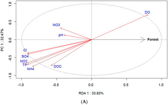 Then, we quantified the relationship between forest cover and physico-chemical water quality by applying a redundancy analysis (RDA, see Legendre and Legendre [], R package vegan []) on LULC independent variables resulting from PCA (see above). This multivariate analysis allows capturing the linear relationship between dependent variables (i.e., physico-chemical variables, referred to as WQ in equations) and a matrix of explanatory variables (i.e., sub-catchments land cover variables). This analysis thus quantifies the percentage of water quality variability explained by LULC variables []. It allows quantifying and excluding the variability explained by certain covariates (e.g., season, year, upstream catchment area). We ran these RDA on centered and scaled variables because of the heterogeneity of the water quality variables units.
