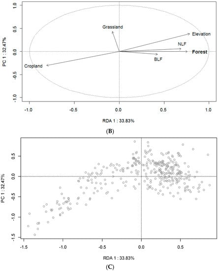 Finally, we distinguished effects from needle-leaved and broad-leaved forest covers while capturing the shared effects between LULC classes and distinguishing those from the elevation effect. We therefore ran several RDA with elevation as covariate and a variation partitioning between most important LULC and elevation []. The latter method divides the explained variance of a dataset between partial effects (i.e., the proportion of variation explained by a particular variable) and shared effects (i.e., variation that cannot be attributed to one variable but is shared between two or more).