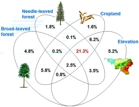Variation partitioning (see Figure 6) splits the variation of water quality dataset into independent effects of LULC classes and elevation (i.e., the proportion of variation that is not shared with other variables) and shared interactions (i.e., interaction that cannot be attributed to a single class). Needle-leaved forest and broad-leaved forest independently explain 4.8 and 1.8% of the total water quality variability, respectively. Broad-leaved forest cover shares 5.8% of explained variability with cropland but only 0.8% with elevation. An important part of variability (21.3%) is shared by needle-leaved forest, cropland cover and elevation, whereas less than 1% is shared by broad-leaved forest, cropland cover and elevation.