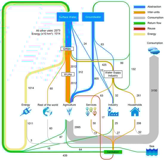 Water flows in the Guadalquivir River Basin 2012 (hm3). Note: Energy flows are in 10 hm3 for scale purposes. Soil water not included. Source: SYWAG Project [39].