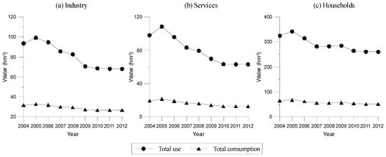 Industry (a), services (b), and households (c) use and consumption of water 2004–2012 (hm3). Source: SYWAG Project [39].