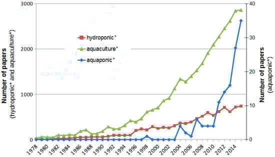 The number of papers published on hydroponic*, aquaculture*, and aquaponic*‡ from 1978 to 2015 (data were collected from the Scopus database on 17 September 2016). ‡ Please note that the scale for aquaponic* is two orders of magnitude lower than hydroponic* or aquaculture*.