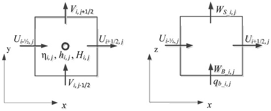 A structured C-grid scheme is used for discretization of the computational domain. The governing equations are solved by the finite difference method (FDM). Figure 1 shows the layout of variables. i and j denote the cell grid center in the x and y direction; U and V are defined at the center of the grid faces (i ± 1/2, j) and (i, j ± 1/2); η, h, and H are located at the center of the grid; The dynamic pressure q is located at the center of the top and bottom surfaces; the dynamic pressure at the bottom qb is at the center of the bottom surface; the dynamic pressure at the free surface is set to be zero in order to satisfy the zero dynamic pressure condition; WS and WB, which are the vertical velocity at the free surface and bottom, are located at the center of the top and bottom surfaces, respectively.