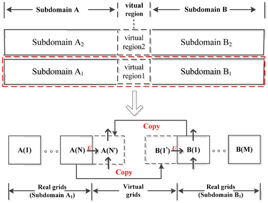Domain decomposition is performed to assign the parallel computational tasks. The number of subdomains is associated with the number of threads. The principle of division is that one thread corresponds to one subdomain. As mentioned above, two subdomains (A and B)—and thus two threads—are created here. One thread is responsible for the computation of Subdomain A or B, not their son regions, e.g., A1 (or A2), B1 (or B2). As domain decomposition blocks the physical connection between Subdomain A and Subdomain B, it is imperative to seek an effective approach for quantifying the inherent connection. A virtual grid technique is used here to link the two subdomains. Take red dashed box in Figure 3 as an example (the box concludes Subdomain A1, vitual region1 and Subdomain B1), a virtual grid is virtually added at the right boundary of Subdomain A1 and the left boundary of Subdomain B1 respectively. The grid cells of the whole computational domain can then be classed into two types: Real grids, i.e., A(1)–A(N) and B(1)–B(M); and virtual cells, i.e., A(N’) and B(1’). The real grids can be divided into two types: Boundary grids A(N) and B(1); and non-boundary grids A(1)–A(N-1) and B(2)–B(M).