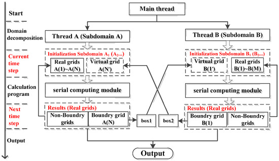 - All variables in the subdomains are initialized after each time step begins. The virtual grids are assigned by reading the containers. Take Thread A as an example, where the assignment of virtual grid A(N’) of Subdomain A1 is achieved by reading box 2. Subdomain A2, A3, etc. are processed in a similar way.