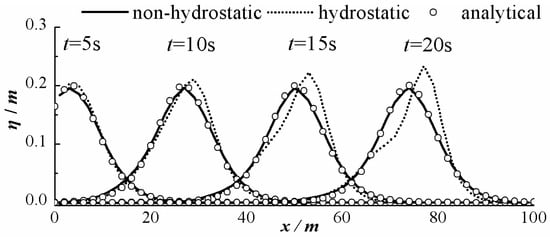 Figure 5 presents the analytical solution of the real waveform and waveforms simulated by the hydrostatic model and non-hydrostatic model at different points in time (t = 5, 10, 15, and 20 s). Figure 6 presents the analytical velocity U and U simulated by the hydrostatic model and non-hydrostatic model at different locations (x = 20, 40, 60, and 80 m). The simulated results of the non-hydrostatic model are in good agreement with the analytical solution, which demonstrates that the non-hydrostatic model can accurately simulate solitary wave propagation over the flat bottom. The simulated results of the hydrostatic model roughly coincide with the analytical solution, however, the simulated value of the wave peak, its occurrence time, and its occurrence position significantly deviate from the analytical solution. The deviation also grows increasingly more significant over time. As shown in Figure 5, the simulated value of the wave peak obtained via hydrostatic model deviates by 25% from the analytical solution when t = 20 s.