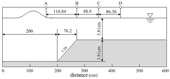 Madsen made an experimental setup to study the solitary wave shoaling over a submerged bar [31], as shown in Figure 7. There was a slope which was 200 cm far from the left side of the channel. The solitary wave propagates from a constant depth h1 = 7.62 cm to a smaller constant depth h2 = 3.81 cm through a slope. There were four stations, A, B, C and D (x = 159.36, 276.2, 365.1, 423.52 cm), observing the free surface. The initial position of the wave crest was at x = −80 cm, and its amplitude was 0.9144 cm. The size of the simulation region is 600 cm and the simulation time is 10 s; Δx = Δy = 5 cm; Δt = 0.001 s.