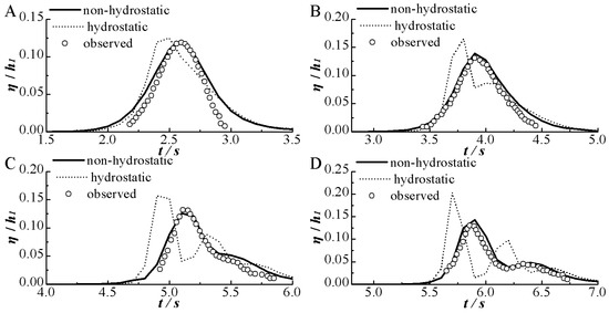 Figure 8 presents the measured values and the simulated values of the non-hydrostatic and hydrostatic models at four monitoring stations: Stations A, B, C, and D. Oscillation occurs in the hydrostatic simulated results at Stations B, C, and D. The main reason for dispersion is that solitary wave splits into a series of short waves when it is under dynamic pressure. After the short waves pass through these three monitoring stations, decreased dynamic pressure, declined dispersion, and disappeared oscillation occur. Clearly, then, the hydrostatic model cannot correctly simulate the short wave and its dispersion effect as the influence of the dynamic pressure is not considered. The simulated results of the non-hydrostatic model closely coincide with the measured data and the simulated results of the 2D non-hydrostatic model previously developed by the author of this paper [20]. In short, it effectively simulates the process of solitary wave propagation from the abyssal zone to the shoal water.