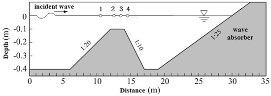 Beji made an experimental setup to study the sinusoidal wave travelling over a submerged bar [1], as shown in Figure 9. The flume is 35 m long, 0.8 m wide, and 0.4 m deep. At the left there was a wave generator making sinusoidal wave trains. Behind the bar, there was a slope as a wave absorber to absorb the waves coming from the left. There were four stations, 1, 2, 3, and 4 (x = 10.5, 12.5, 13.5, 14.5 m), observing the free surface. The sinusoidal wave had a wave amplitude and period of 0.01 m and 2.02 s, respectively. The size of the simulation region is 30 m (x = 0~30 m) and the simulation time is 40 s; Δx = 0.05 m; Δy = 0.1 m; Δt = 0.005 s.