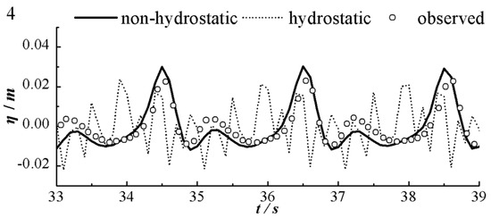 Figure 10 presents the observed water level at Stations 1–4, as well as the simulated results of the non-hydrostatic and hydrostatic models. The simulated value of the hydrostatic model significantly differs from the observed value and violent oscillation occurs in the simulated water level, thus, the simulation is inaccurate. Conversely, the simulated value of the non-hydrostatic model excellently coincides with the observed data, indicating that the non-hydrostatic model proposed in this paper accurately simulates sinusoidal wave propagation along submerged breakwater.