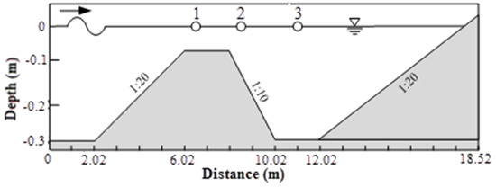 In addition to Beji, Nadaoka made a smaller experimental setup [32], as shown in Figure 11. There was a 18.52 m long and 0.3 m deep channel. At the left was a wave generator making sinusoidal wave trains. Surface elevations were measured at three locations (x = 6.52, 8.52, 11.02 m). The sinusoidal wave had a wave amplitude and period of 0.01 m and 1.5 s, respectively. The size of the simulation region is 12 m (x = 0~12 m); the simulation time is 40 s; Δx = Δy = 0.1 m; Δt = 0.01 s.