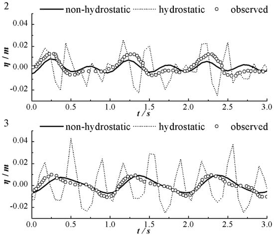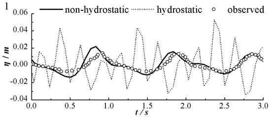 Figure 12 presents the measured values of the water level η at three monitoring stations and the simulated η via non-hydrostatic and hydrostatic models. The simulated values of the non-hydrostatic model are in good agreement with the measured values, indicating that the non-hydrostatic model indeed simulates the short wave dispersion generated as the wave passes through an area with abrupt changes in terrain. Compared to the simulated results by the hydrostatic model in Beji’s experiment, more violent oscillation occurs in the simulated η in Nadaoka’s experiment due to the fact that the incident wave in the latter has a shorter period and higher nonlinearity and diffusivity compared to that in the former. More significant simulation distortion occurs in the hydrostatic model, as no dynamic pressure is taken into account.