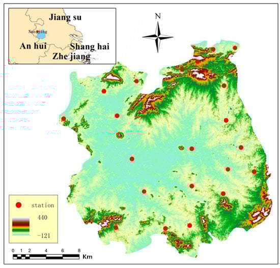 In this paper, the Qinhuai River basin (approximately lat 32°2′ N and long 118°78′ E) is selected as the studied catchment. The Qinhuai River basin is located downstream of the Yangtze River, which is in the southwestern part of Jiangsu Province, with a total area of 2658 km2. The region where it is located ranges from the northern subtropics to mid-subtropical. The long-term annual air temperature is 15.4 °C, and the annual range of air temperatures can reach as high as 40 °C. The topography mainly contains plains, hills and mountains. The highest mountain’s altitude is greater than 2400 m. The annual average sunshine time is 2240 h, and the annual average precipitation is 1047.8 mm. The location of the study area, together with the distribution of the meteorological stations used in this study, is shown in Figure 1.