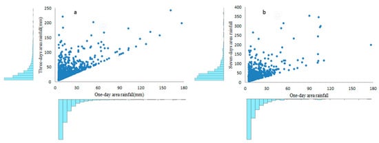 Scatter plots of the one-day and multi-day rainfall with marginal histograms. (a) one-day and three-day rainfall (b) one-day and seven-day rainfall.