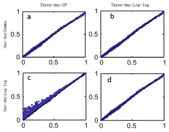 Q-Q plots for the Gumbel and empirical copulas for different marginal distribution combinations of one-day rainfall and three-day rainfall. (a) Gamma (one-day) vs. GP (three-day); (b) Gamma (one-day) vs. Log-log (three-day); (c) Log-log(one-day) vs. GP (three-day); (d) Log-log (one-day) vs. Log-log (three-day).