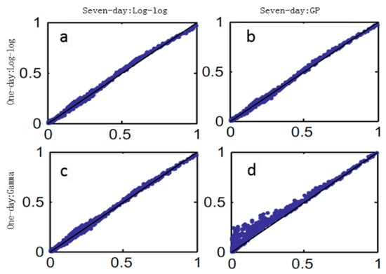 The K–S statistics for one-day, three-day and seven-day rainfall are provided in Table 2 and Table 3. The p-values measure the amount of information against the null hypothesis H0 and are also provided here. The smaller the p-values, the more evidence we have against H0. For the series of one-day and three-day rainfall, the four distributions of one-day rainfall, i.e., GEV, Gamma, Log-Log and Gamma, cannot be rejected with K–S tests and have a decreasing ranking according to the statistical values. However, for three-day rainfall, the GP distribution performs best, followed by Log-Log, GEV and Gamma. Similarly, for the series of one-day and seven-day rainfall, GEV and GP are the best distribution for one-day and seven-day, respectively, while GP and Gamma are the worst distributions for one-day and seven-day, respectively. None of the three distributions can be rejected based on K-S tests. In many cases, it is not possible to determine one single best distribution, particularly when a relatively short series of data is available []. All of the three distributions are used to investigate the bivariate distribution using copulas.