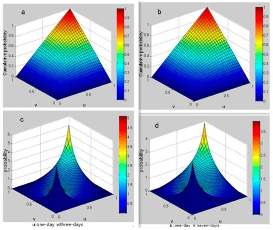 Three-dimensional plots for the theoretically fitted Gumbel copula. (a) fitted copula using a shaded surface of one-day and three-day; (b) fitted copula using a shaded surface of one-day and seven-day; (c) upper tail correlation of one-day and three-day; (d) upper tail correlation of one-day and seven-day.