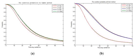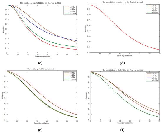 To reflect the connection between the one-day and multi-day rainfall, the conditional probability of multi-day rainfall can be calculated based on the reappearing period of one-day rainfall, and different copulas are used here to see the difference between them. Figure 6 shows the conditional probability of three-day and seven-day rainfall, which is when a one-day rainfall occurs over an x-year return period, the probability of three-day rainfall and seven-day rainfall occurs. For the series of one-day and three-day, Gamma vs. GP pairs are used, and for one-day and seven-day, Log-log vs. GP are used. Figure 6a–c show that when the one-day rainfall is over a value, the probability of three-day rainfall increases with the decrease in the value of precipitation, the conclusion is also correct with respect to seven-day rainfall. When the precipitation of a three-day rainfall is fixed, its probability increases with the same tendency as that of the precipitation of one-day rainfall. However, for fixed precipitation of one-day rainfall, the probability of seven-day rainfall changes according to the crosscurrent of the precipitation. However, the seven-day rainfall changes little compared to the three-day rainfall when the one-day rainfall changes.