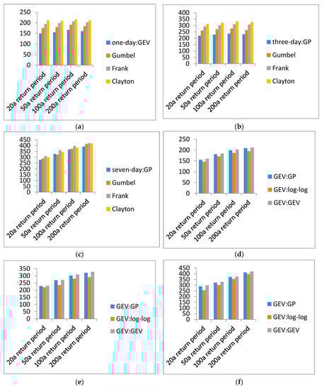 Design values for a single variable and two-dimensional copula joint distributions. (a) GEV (one-day) vs. copulas (one-day); (b) GP (three-day) vs. copulas (three-day); (c) GP (seven-day) vs. copulas (seven-day); (d) one-day rainfall of Gumbel using different marginal distributions; (e) three-day rainfall of Gumbel using different marginal distributions; (f) seven-day rainfall of Gumbel using different marginal distributions.