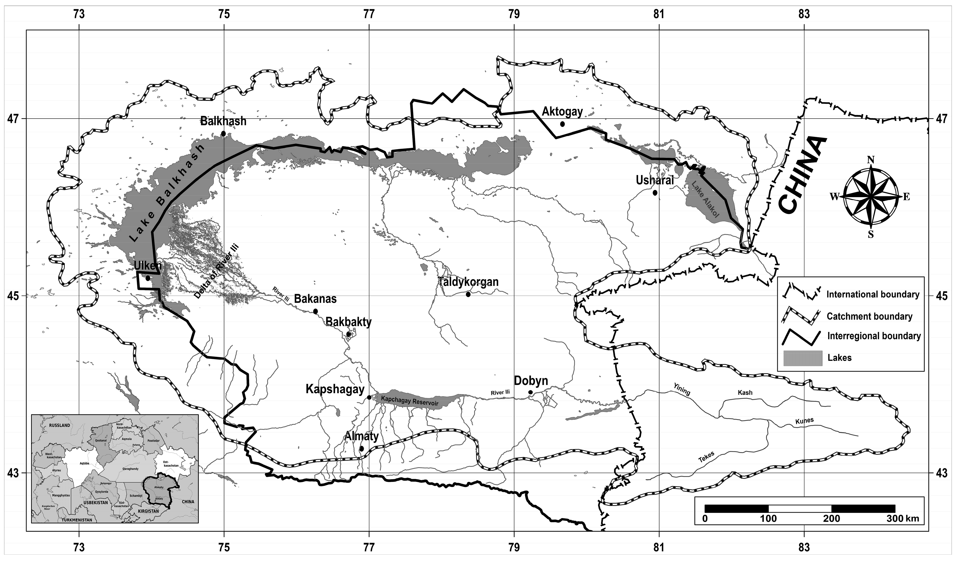 - Dostaj, Z.D.; Giese, E.; Hagg, W. Wasserressourcen und deren Nutzung im Ili-Balchaš Becken; Zentrum für Internationale Entwicklungs und Umweltforschung: Giessen, Germany, 2006. [Google Scholar]