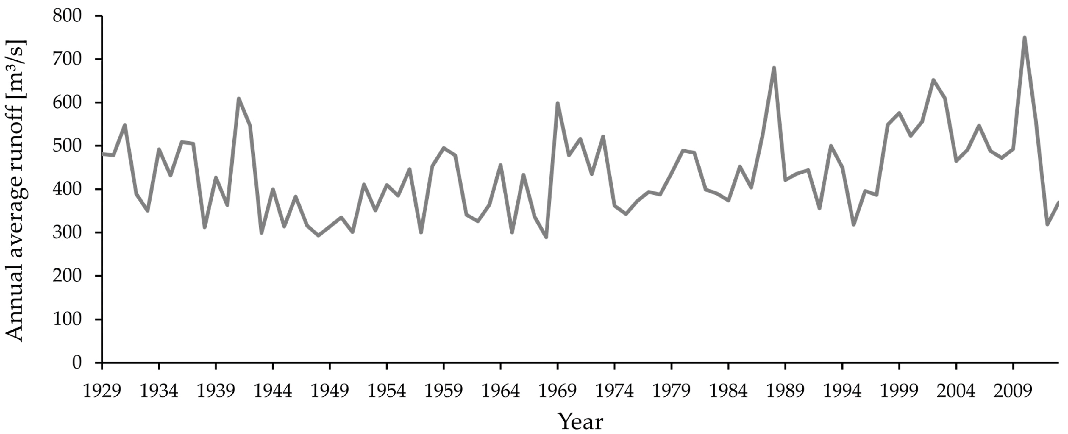 Annual average runoff of the Ili River at hydrostation in Dobyn (m3/s) [30].