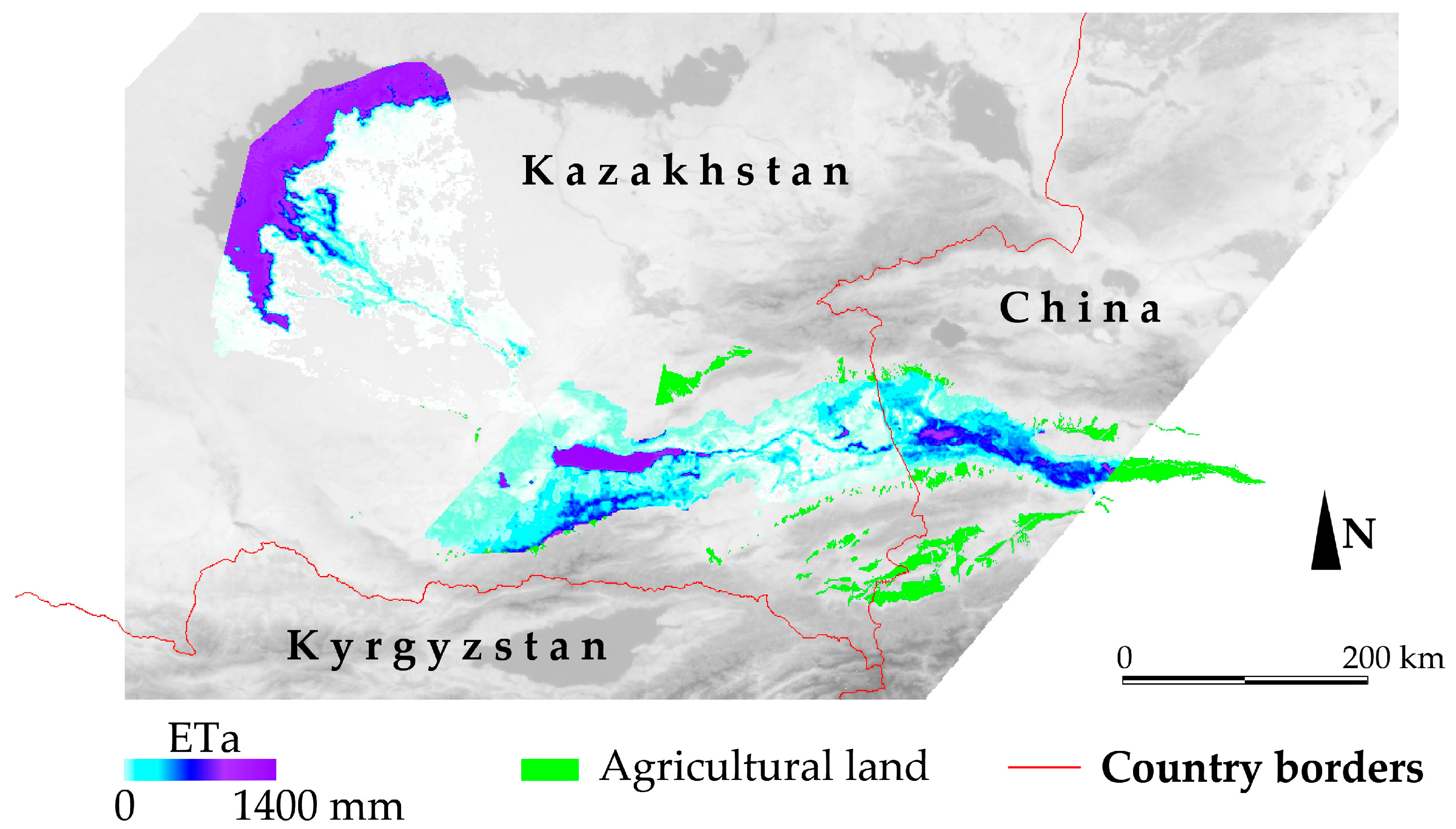 Actual evapotranspiration (ETa) of the growing seasons 2000, 2005, 2009, 2010, and 2014 was mapped based on MODIS satellite images for agricultural land and riparian ecosystems in the Ili river basin. The Simplified Surface Energy Balance Index (S-SEBI) approach was used to make the ETa maps [38,39,40].