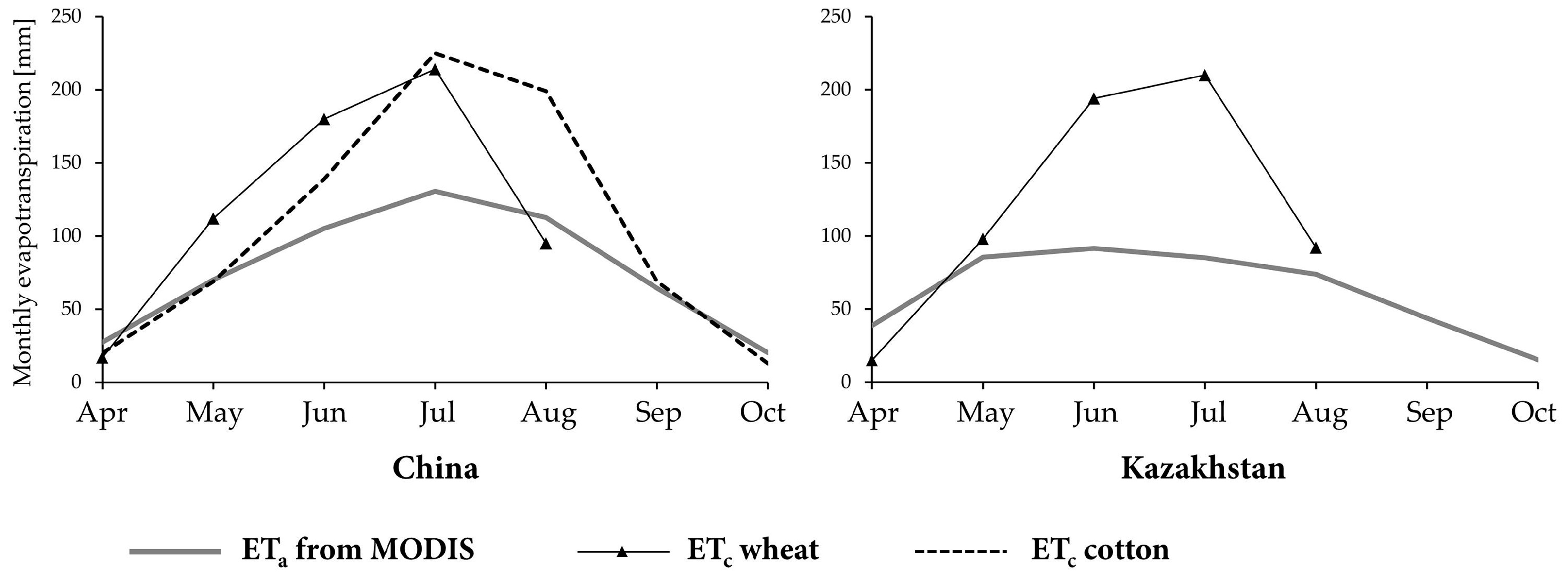 Monthly actual evapotranspiration, ETa, from MODIS (average from 2000, 2005, 2009, 2010, and 2014) for agricultural land along the Ili River in China and Kazakhstan, and monthly ETc for wheat and cotton.