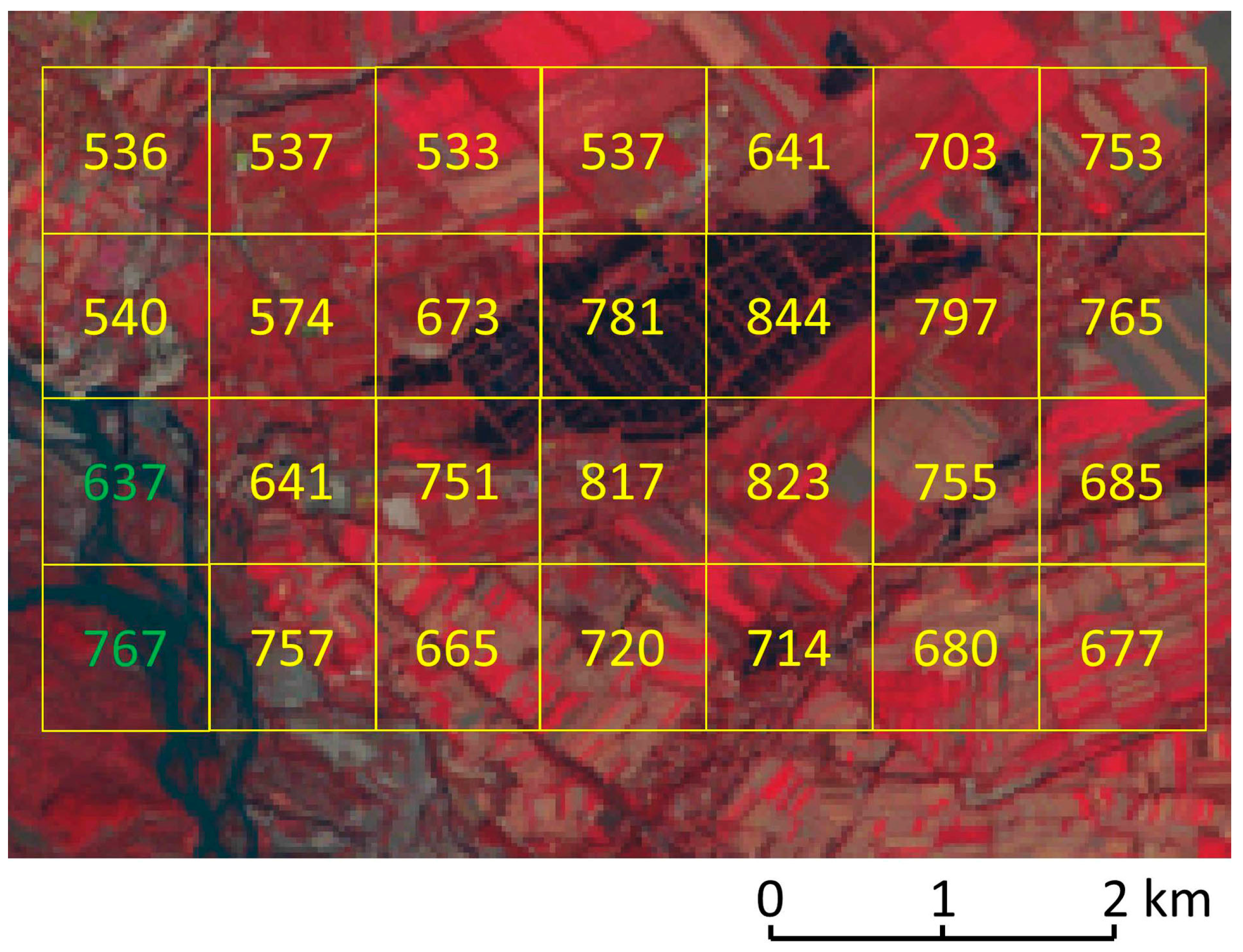ETa of a representative area of agricultural land in the Ili Prefecture over the growing season of 2014. Yellow boxes show pixels of the ETa map. Yellow numbers: ETa (mm) within the given pixel. These pixels belong to agricultural land as used in this study. Green numbers: ETa (mm) within the given pixel. These pixels belong to riparian vegetation. Background: Landsat image (LC8, path 147, row 30) from 9 September 2013.