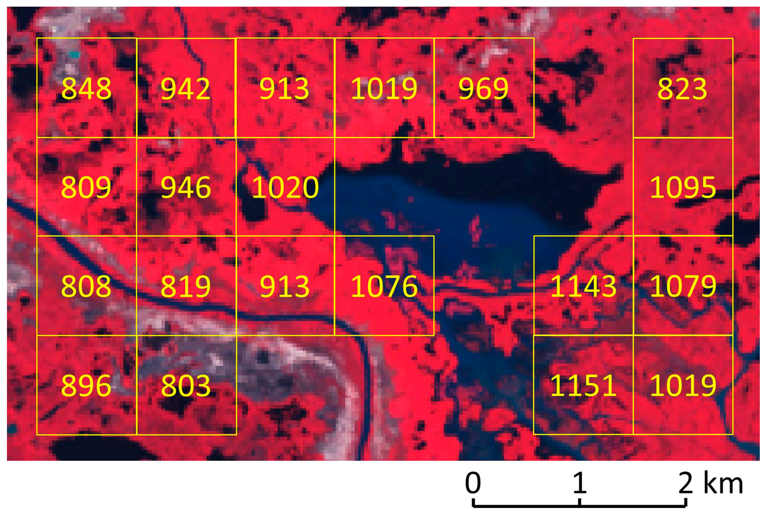ETa of a representative wetland area in the Ili Delta over growing season 2014. Yellow boxes show pixels of the ETa map. Yellow numbers: ETa (mm) within the given pixel. These pixels belong to submerged dense reed. Background: The areas not covered by pixels are either open waters or vegetation other than reed. Landsat image (LC8, path 151, row 28) from 19 August 2013.