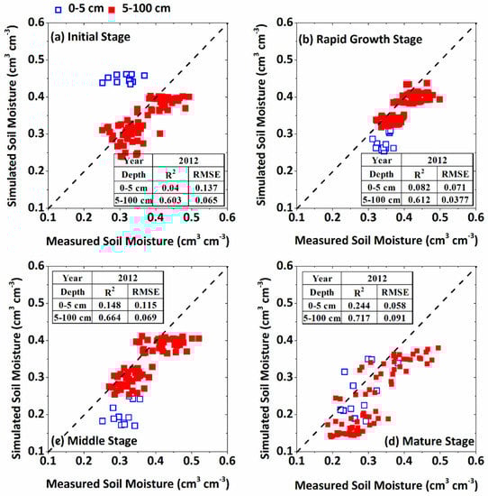 Soil moisture observed at different sunflower growth stages were well captured by the WFSP model except for the surface soil (0–5 cm) in the model calibration process (Figure 4, Year 2012). More exactly, R2 in initial, rapid growth, middle, and mature stages for 5–100 cm depth were 0.60, 0.61, 0.66, and 0.72 respectively while RMSE were only 0.07, 0.04, 0.07 and 0.09 cm3·cm−3 respectively.