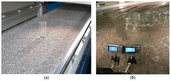 For the monitoring of the channel bed evolution in the vicinity of the pier, two waterproof cameras (Olympus Stylus Tough—6020, Olympus Corporation, Tokyo, Japan) were used. The cameras were mounted firmly on the sidewalls of the flume close to the test section, as shown in Figure 1b, and were recording videos at 30 frames per second, with resolution equal to 720 × 1280 pixels, while being partially submerged. The dimensions of the cameras were 100 × 65 × 26 mm. The purpose was to record the lateral half of the scour hole and assume symmetry about the centerline of the flume. In that area every 1 cm2 was represented by more than 6500 pixels. The distance of the cameras from the bed and the cylinder were approximately 180 mm and 400 mm, respectively. Before the beginning of the experiment, water was introduced gradually, while an adjustable tailgate at the downstream end of the flume was raised. As soon as the flow reached the desired depth, the cameras were synchronized using a stroboscopic light, and started recording videos. The target velocity was reached by adjusting the flow discharge and the tailgate. At the completion of the experiment, the flow discharge was reduced and the tailgate was raised. Before draining the flume, the velocity of the flow was greatly decreased and the bed bathymetry was measured with a point gauge to validate the accuracy of the primary measurements.