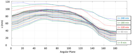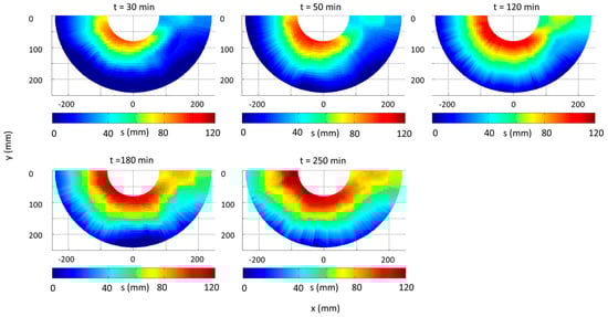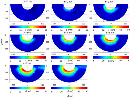 Figure 2 includes representations of the scour depth maps during the first 8 min of the experiment. It is shown that scour starts at planes 45°–110° from the axis of symmetry. Some small erosion is also observed at a radial distance r = 90 mm from the surface of the cylinder, at planes 60°–100°; but the maximum scour is adjacent to the cylinder surface. From the sequence of the contour maps shown in Figure 2, it is evident that the maximum depth during the first 8 min is constantly located around the 60° plane. The scour hole expands around the perimeter of the cylinder and reaches the axis of symmetry, θ = 0°, after approximately 3 min. Scour depth along the axis of symmetry remains significantly smaller compared to that at the sides for the duration of the experiment. Overall, the radial span of the scour hole increases continuously during the first 8 min, reaching a maximum value of 107 mm at the 20° plane.