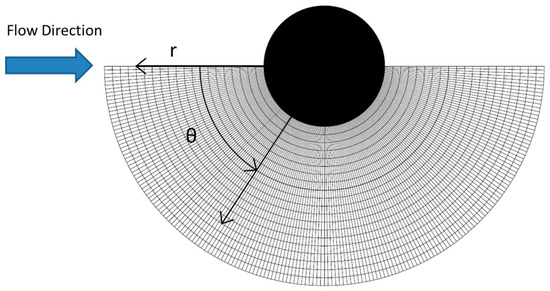 The cylindrical grid that was used for the statistical analysis of the scour hole’s morphology. r: radial distance from the surface of the pier; θ: angle of the plane around the cylinder.