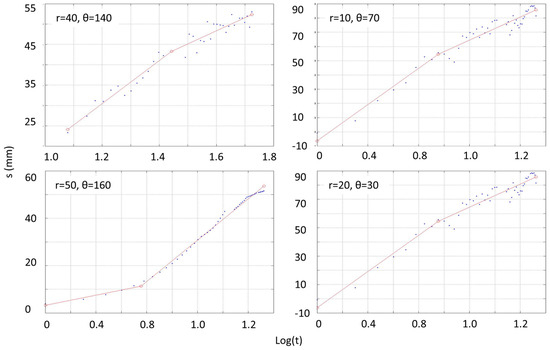 For the same 18 × 20 cylindrical grid a regression analysis was carried out to express scour depths as function of time. To do that, a Matlab code was written to fit logarithmic, power and polynomial functions to describe the temporal evolution of scour at all locations and evaluate the statistical justification of these functions based on the coefficient of determination (R2) and the sum of squared errors (SSE). It was found that the temporal evolution of the scour depth at every location with θ < 130° could be optimally (R2 > 0.95) described by a piecewise power function, with one breakpoint. The area of the scour hole with θ ≥ 130° was described less successfully (R2 ~ 0.7) by power functions. Table 1 shows the general form of the equations that describe scour as a function of time and Figure 7 illustrates some examples of the curve fitting results. The breakpoint that most accurately separates the two distinct scour rates was placed successfully at t = 9 min for the locations where scour started during the first 3 min of the experiment (see Figure 2). At the locations where scour started later, the breakpoint was placed at succeeding instants that varied significantly.