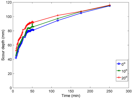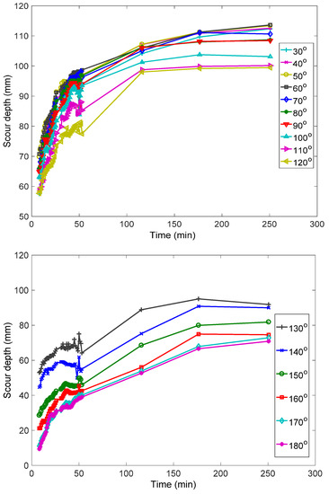 An additional distinction could be made for the area with θ 0° < θ ≤ 20° where the slopes of the curves after the breakpoint were consistently higher compared to the slopes of the curves at 20° < θ < 130°. This is illustrated in Figure 8, where pointwise scour is plotted against time for locations with r = 10 mm and θ varies from 0° to 180°. It is shown that after the initial phase (t ≥ 9 min) the scour rate at 0° < θ ≤ 20° is greater compared to the other plane sectors. As a result, at t = 250 min the scour depth is higher at this region. As can be observed in Figure 8, the shapes of the scour depth evolution curves for θ ≥ 130° are significantly different compared to the other planes, and they cannot be described accurately by a relatively simple function.