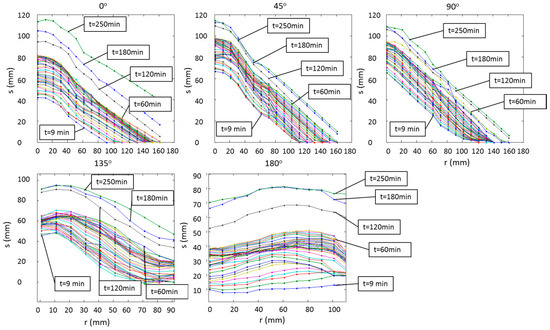 Scour depth against radial distance from the surface of the cylinder, for various instants after t = 9 min, in 5 angular planes, around the cylinder.
