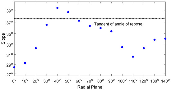 The time-averaged slope of every radial profile, after t = 9 min was found from the instantaneous linear fits of the radial profiles (as shown in Figure 9). The results are plotted in Figure 10. It is shown that the average slopes at different angular planes vary significantly. They increase from θ = 0° to θ = 40° and then they decrease from θ = 40° to θ = 110°. Also, the time-averaged slopes at approximately 35° ≤ θ ≤ 55° are higher than the estimated angle of repose (35°).