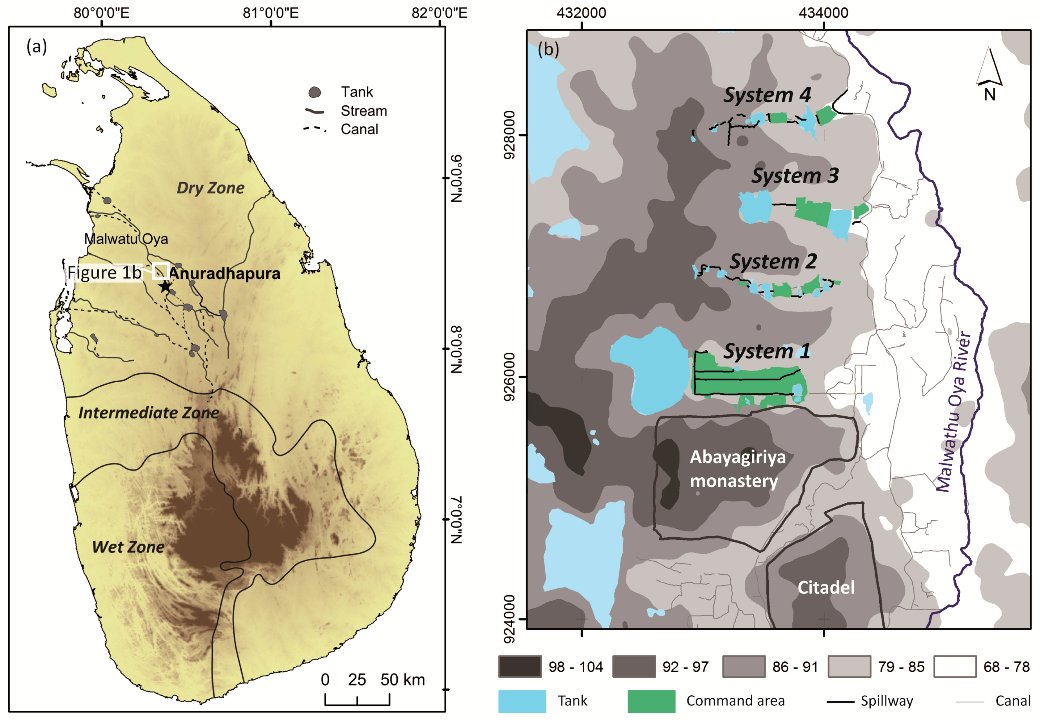 In the north-central dry zone of Sri Lanka, rainfall and surface runoff have been stored in human-made reservoirs since ancient times and today continue to provide water for irrigation [1]. During the two main rainy seasons in January–April and September–December, surface runoff is collected and stored in these reservoirs, the so-called tanks or wewas, and successively distributed during the dry periods to the paddy fields located downslope. The tanks are arranged in a cascade-like fashion along shallow valley courses. They are connected by canals and spillways and build a complex system of floodwater harvesting, water storage and water distribution [2].