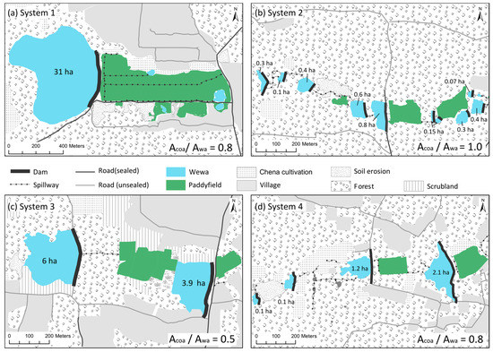 Sketches (a–d) show the layout of four tank cascade systems north of Anuradhapura (a) system 1; (b) system 2; (c) system 3; (d) system 4. (Acoa: water-spread Area, Awa: water-spread area).