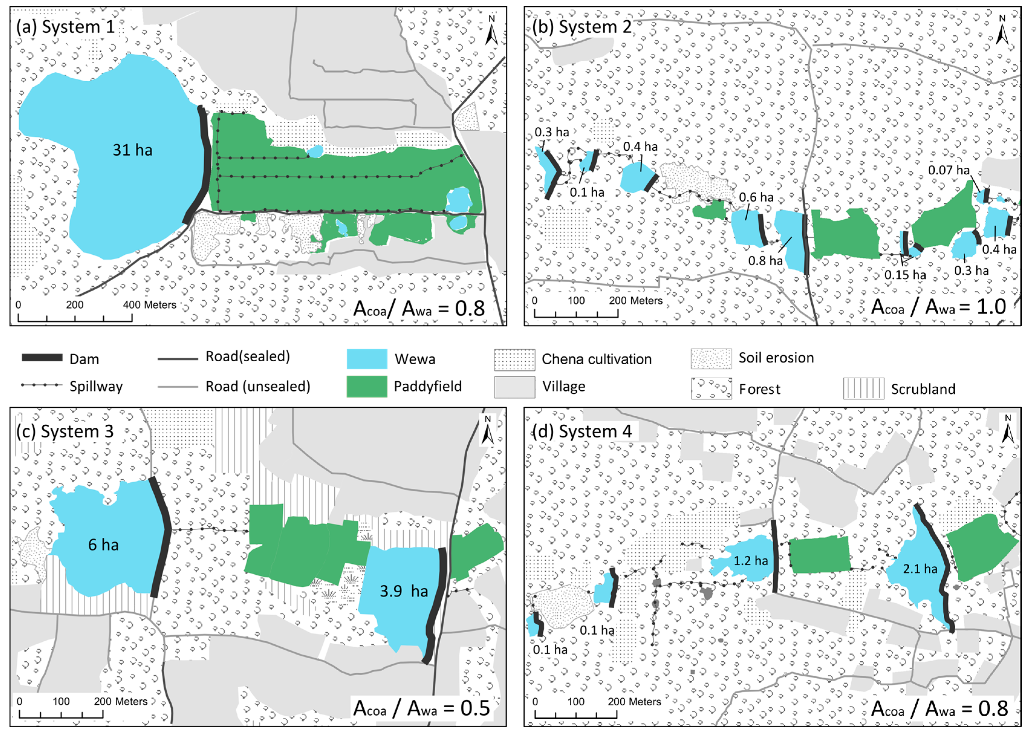 The most southern system, system 1, consists of only a single tank, 31 ha in size (Figure 2a). The water of this tank is used to irrigate a paddy field, located directly downstream of the tank. Three spillways, constructed as shallow canals, dug in the soil, are used to distribute the irrigation water through the paddy fields. A village is situated north of the paddy field. A small strip between the paddy field and village, as well as small patches north and west of the tank, are used for chena cultivation. The described setting is surrounded by an open deciduous forest. The Acoa/Awa ratio totals 0.8.