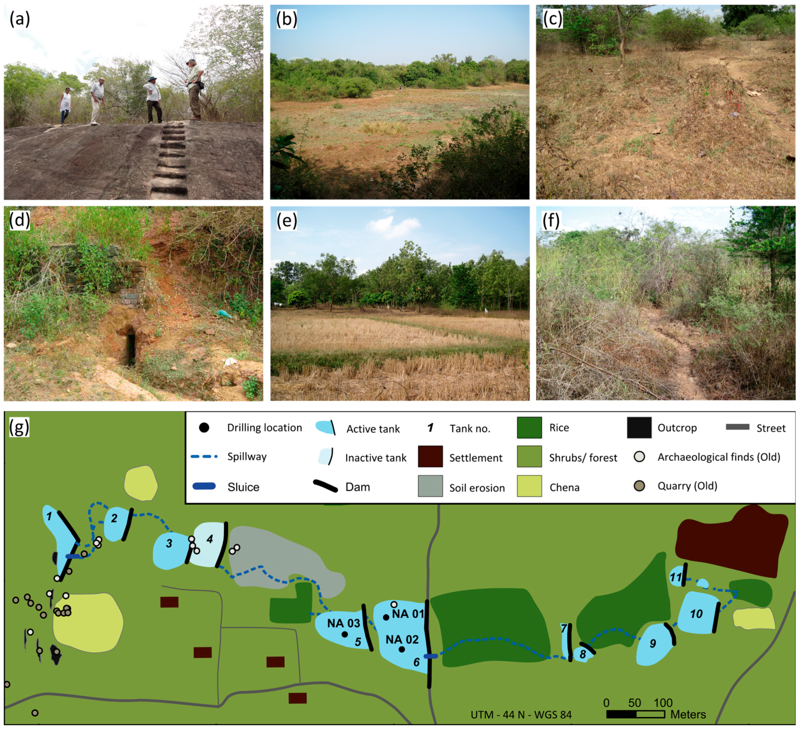 Detailed set-up and characteristics of system 2: (a) bedrock outcrop, with sculptured stairs as the western boundary of tank 1; (b) view from the dam of tank 6 into the desiccated water-spread area; (c) area affected by soil erosion; (d) sluice of tank 6; (e) paddy field between tank 6 and tank 7; (f) shallow earthen spillway connecting tank 4 and tank 5 surrounded by scrubland; (g) detailed layout of system 2, showing the bedrock outcrops in the headwater area, distribution of archaeological findings and the location of sediment profiles NA01-NA03.