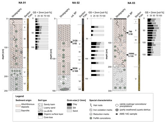 In the upper periphery of tank 6, approximately 50 m west of its dam, drilling NA01 was conducted, extracting 250 cm of undisturbed sediments. The sediments of NA01 are not stratified and consist of loamy, sandy and gravely material (Figure 4). Corresponding to their macroscopic character, the sediments are subdivided into six units (Table 3). Underlying units VI and V comprise the basal section of profile NA01 (170–250 cm b. s.), which is represented by the saprolite with unweathered fragments of quartz and feldspars. The superimposing units I–IV (1–170 cm b. s.) are characterized by fine-grained sediments of allochtonous origin. The uppermost centimeter of the sediment profile consists of undecomposed plant remains. The sediment color lightens from top to bottom, changing from dark brown to olive and pale brown to yellowish/white. Throughout the whole profile, sesquioxide oxidation marks and concretions in different sizes occur frequently. Calcite precipitation appears as fine distributed powder and coatings.