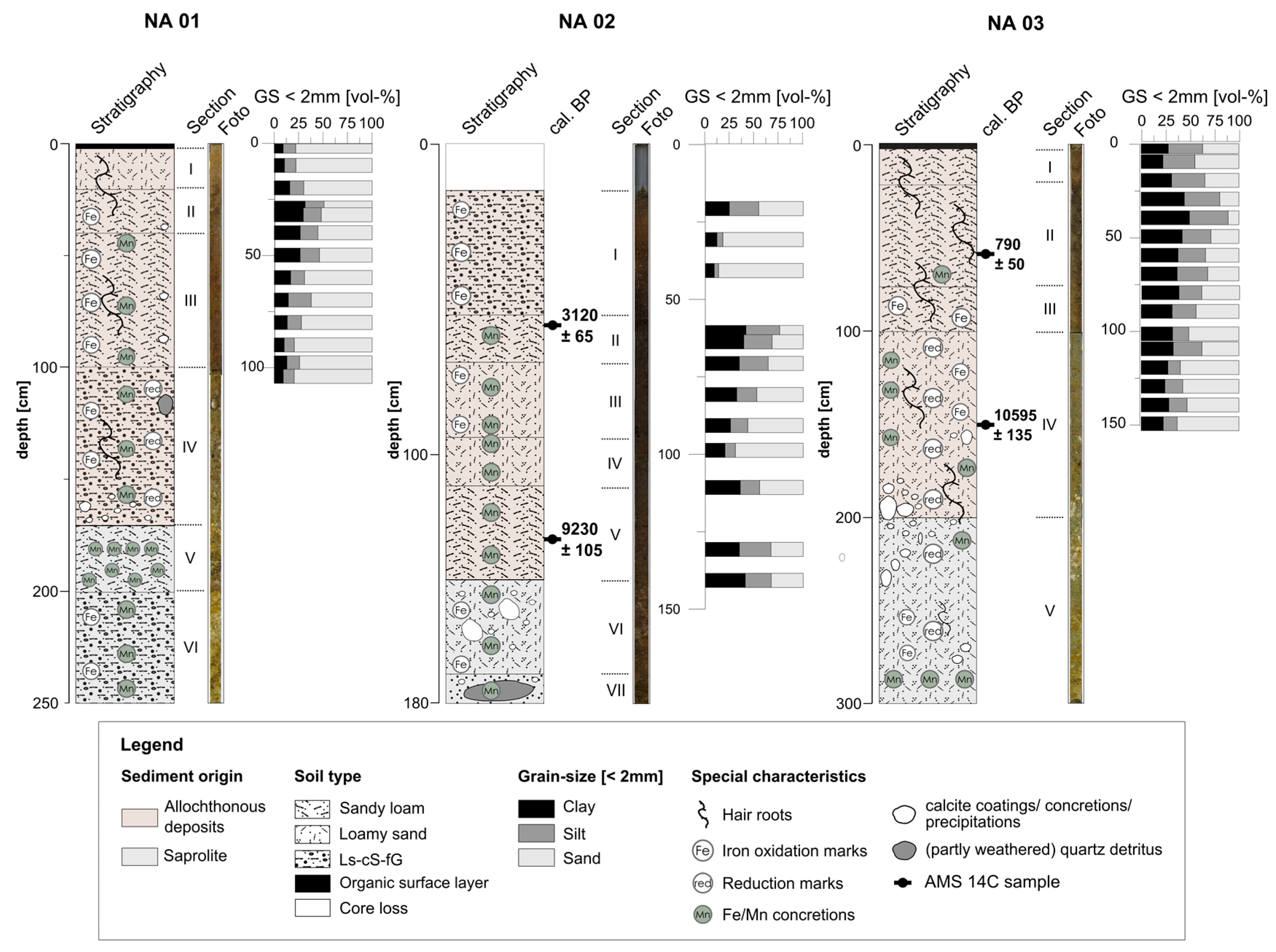 Sediment profile NA03 was extracted from tank 5 approximately 35 m upstream of the dam and comprises 300 cm of undisturbed sediments. Corresponding to their macroscopic character, the sediments are subdivided into five sedimentological units (Table 5), which are classified in two main sediment sections: the highly weathered, saprolitic base of this profile is represented by unit V (200–300 cm b. s.), whereas the overlying sediment units IV to I are composed of unlayered loamy, sandy and gravely allochtonous material (Table 5). The uppermost 2 cm of the profile consists of organic litter. Sediment colors become brighter with increasing depth, changing from dark brown at the top to yellowish/pale brown at the bottom of the sediment profile. Sesquioxide oxidation marks and concretions, as well as calcium carbonate precipitations occur frequently as non-cured, fine, distributed powder.
